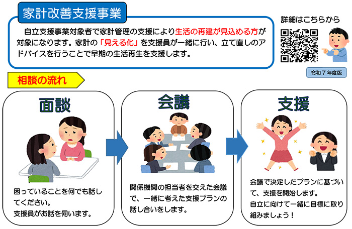 「現在は生活保護を受給していないが、生活保護に至るおそれがある人で、自立が見込まれる人」を対象に、困りごとにかかわる相談に応じ、安定した生活に向けて仕事や住まいなど、様々な支援をするものです。生活保護から脱却した人でも、再び最低限の生活を維持できなくなることがないよう、支援の対象となります。